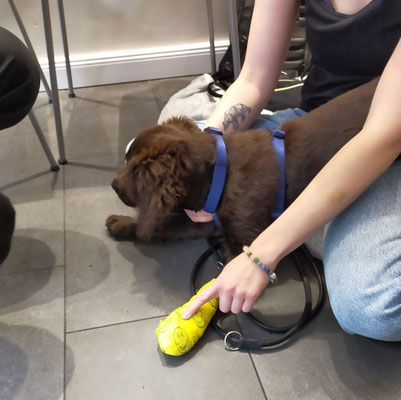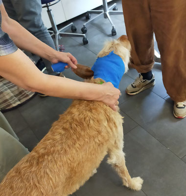 'Der Erste-Hilfe-Kurs für Hunde in der Tiermedizinischen Praxis Rotherbaum war gut besucht, insbesondere im Hinblick auf das Verhältnis von Raumgröße und Anzahl der Hunde. Generell hätten jedoch sicherlich auch mehr Teilnehmende daran teilnehmen können. Die sehr sympathische Dozentin und Tierärztin führte uns durch verschiedenste Situationen und Präventionsmaßnahmen. Besonders wertvoll waren die praktischen Übungen, bei denen wir Verbände an unseren eigenen Hunden anlegen konnten. Zudem erhielten wir Verbandsmaterial für den Ernstfall sowie ein Handout, das uns hilft, zuhause eine Notfalltasche mit den wichtigsten Informationen zusammenzustellen. Für ausreichend Pausen, Wasser und eine wunderbare Versorgung mit Kuchen war ebenfalls gesorgt.'